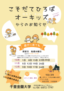 千里金蘭大学が実施している子育て支援プログラム「子育てひろばOh!キッズ」の今年度10月~12月の開室予定日をご案内いたします。