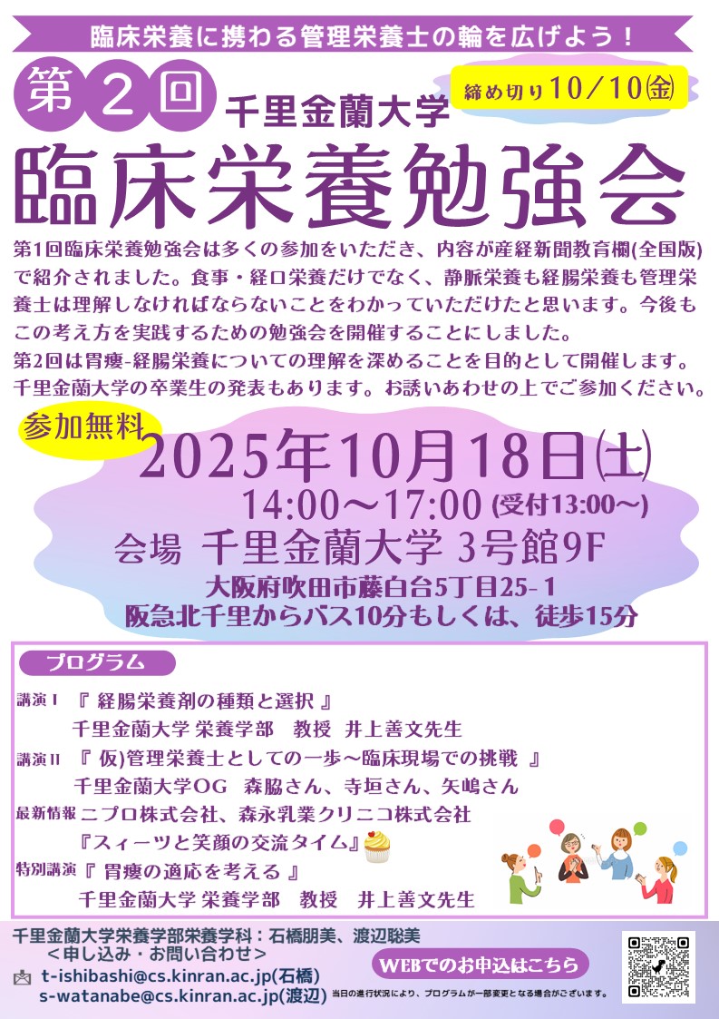 「令和7年度 第2回 臨床栄養勉強会 」を千里金蘭大学にて開催します