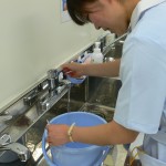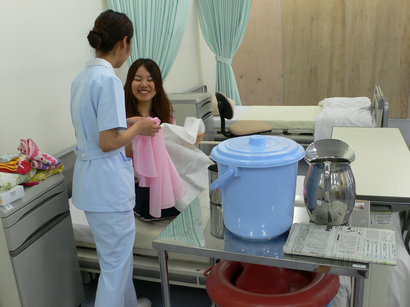 看護師さん役、患者さん役と決めて洗髪の実習を開始します。