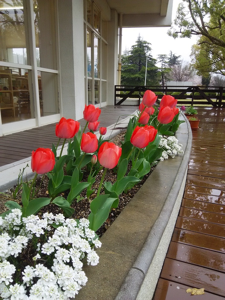 花壇のチューリップはきれいに咲きだしていますが、あいにくの雨もよう。