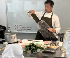 京都ハラールネットワーク協会の理事をされている京都料理学校の小川洸校長先生にご指導いただきました。和食といえば、やはり「だし」は欠かせません。昆布とかつおの混合だしで、「豆乳胡麻汁」を作ります。(ラーメンをいれても美味しい)