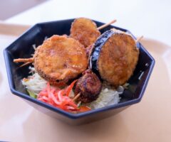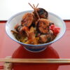 ご飯にせん切り野菜、なすとイワシの串カツが載った丼。大阪らしくソースをかけていただきます。
